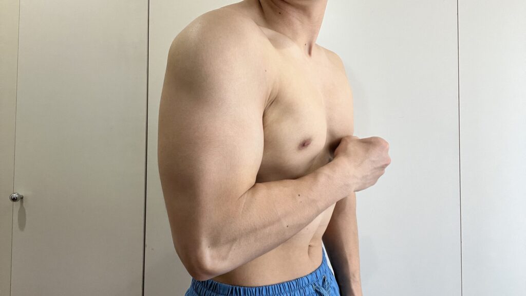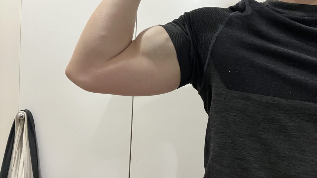 腕周り36cmはどんな感じか。鏡で見ると「腕のボリュームが増してきたな」と感じますが、写真で見ると全然細いという印象ですね。