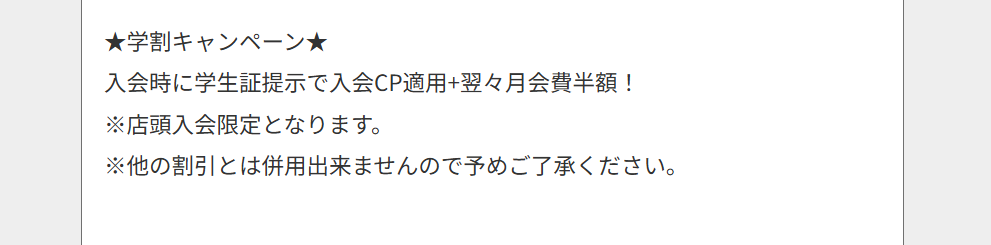 ジムの店舗によっては、学割でお得に通えることがあります。家の近くのジムに学割キャンペーンがあるか確認してみましょう。