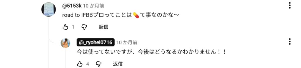 動画のコメント欄で、ステロイド使用を否定しています。